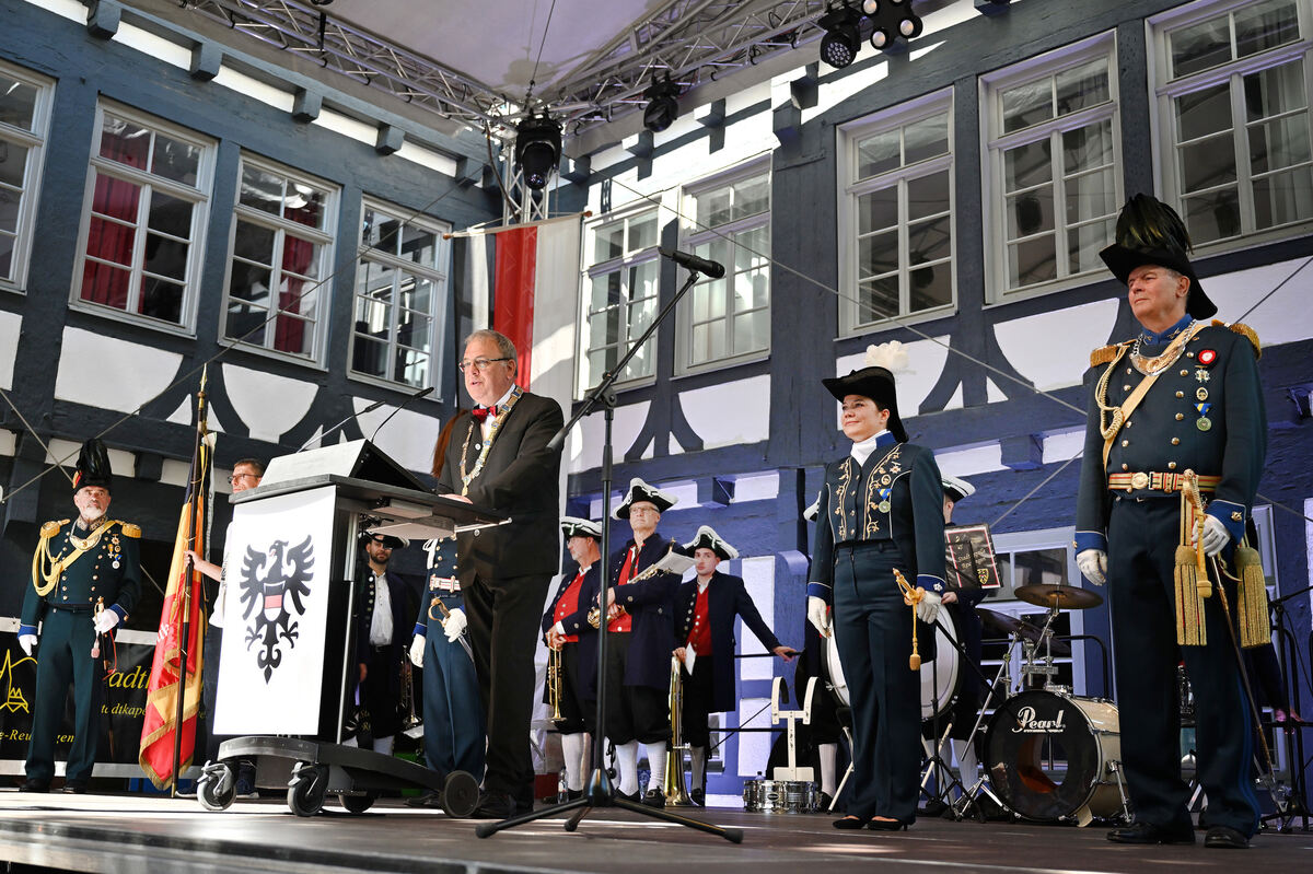 Schwörtagsrede vor historischer Kulisse: OB Thomas Keck mit Stadtgarde und Musikern der Stadtkapelle. FOTOS: PIETH