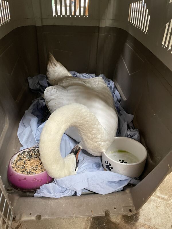 »Der Schwan konnte seinen Fuß nicht mehr bewegen. Als wir ihn uns näher angeschaut haben, fielen uns dann auch Bissspuren auf«, sagte Wiedemann. Er betreibt in der Nähe einen Bau- und Gartenservice und sich hat zusammen mit seiner Freundin Ramona Frey schon öfter um Tiere aus dem Wasenwald gekümmert. Zuletzt zogen sie Frischlinge groß, die keine Eltern mehr hatten und versorgten ein Reh, das von einem Hund gebissen wurde. Und jetzt also einen Schwan.