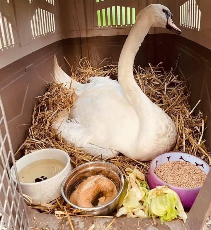 Nachdem sie das Tier in ihre Obhut genommen hatten, versuchten sie zunächst das Vogelschutzzentrum in Mössingen zu erreichen. Die haben ihn jedoch einschläfern wollen, sagte Frey und ergänzte: »Dafür ging es dem Schwan aber noch zu gut, deshalb haben wir uns in Absprache mit dem Jagdpächter dafür entschieden, es da zu behalten.« Ein Tierarzt, der sich mit Geflügel auskennt, stellte ihnen Antibiotika und Schmerzmittel zur Verfügung. Außerdem wurde die Wunde täglich mit Kochsalzlösung ausgespült und mit Jodseife gewaschen.