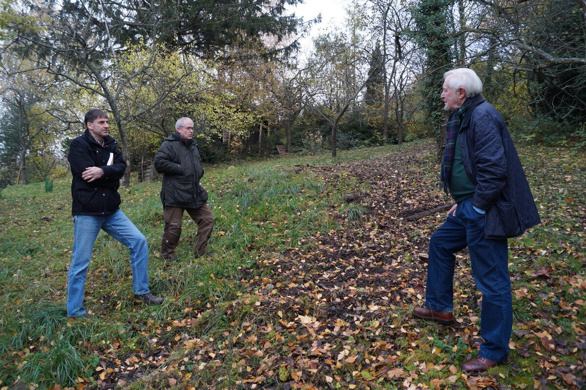 Beim Ortstermin (von links): Der Wildtierschutzbeauftragte Rupert Rosenstock, Jagdpächter Matthias Bögle und Gütlesbesitzer Dieter Mutschler. FOTO: WURSTER