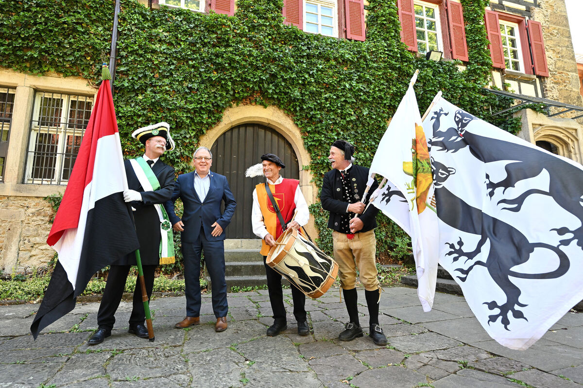 Vor dem Heimatmuseum wird die Tradition hochgehalten: Reutlingens Fahnenflaiger Thomas Walker (von links), OB Thomas Keck, Trommler Arnold Brall und Christian König, Autor des Fachbuchs und selbst Fahnenschwinger.