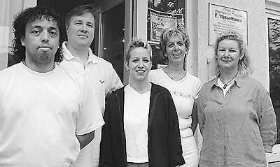 25 Jahre Praxis Wasserburger in der Oberen Gerberstraße mit (von links): John Schorer, Martin Abele, Monika Utke, Karin Aulwurm und Inhaberin Eva Wasserburger-Gahn.