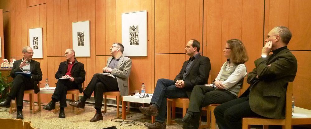 Auf dem Podium: Jörg Barthel, Karlheinz Kleinbach, Christof Voigt, Uwe Kloos, Gabriela Tullius, Bernd Banke (von links). Foto: Theologische Hochschule/Härtner