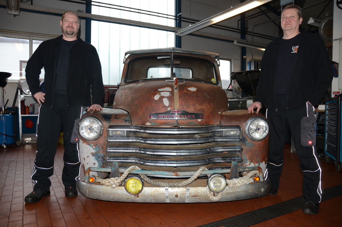 Richtig gebraucht soll er aussehen: Andreas (links) und Rainer Kienle mit einem 70 Jahre alten Chevrolet Pick-Up, der absichtlich im Vintage-Look gehalten ist. Der Flugrost ist Absicht.