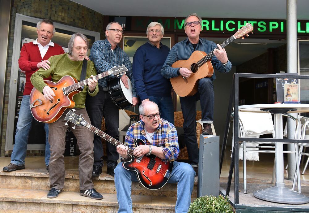 »The Crashers« in der aktuellen Besetzung mit Bassist Manfred Körner (sitzend) und (hinten von rechts) den Gitarristen Peter Pfanner und Reinhold Schindler, Schlagzeuger Jürgen Renner, Gitarrist Frank Benz und Manager Gerhard Bezler.
