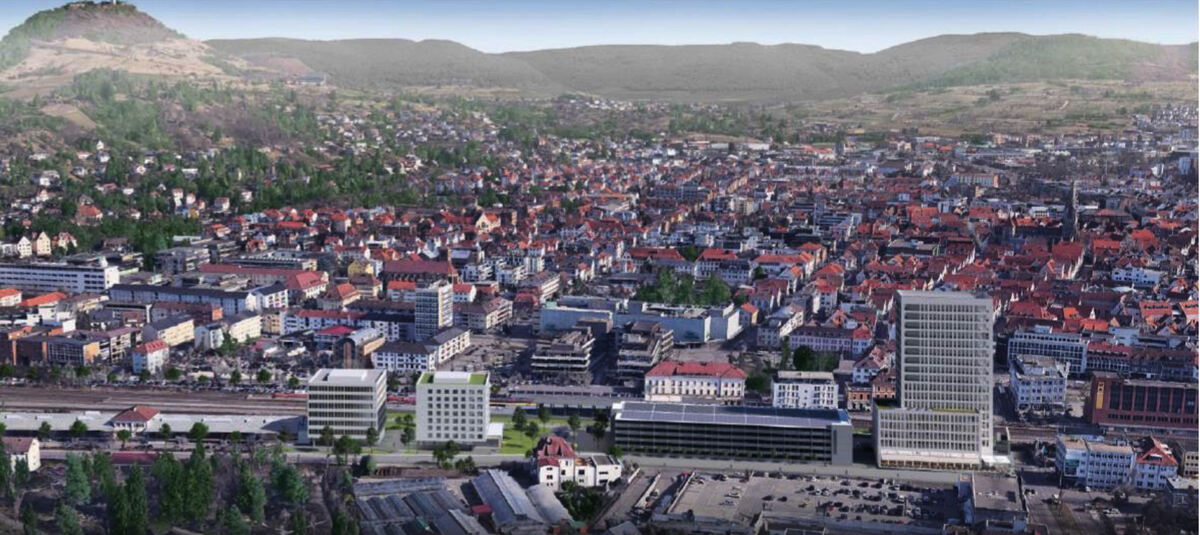 Blick in die Zukunft auf die Nordseite der Bahnlinie: Stuttgartert Tor und Hotel stehen bereits. Das siebengeschossige Gebäude links soll als nächstes realisiert werden. FOTO: STADT