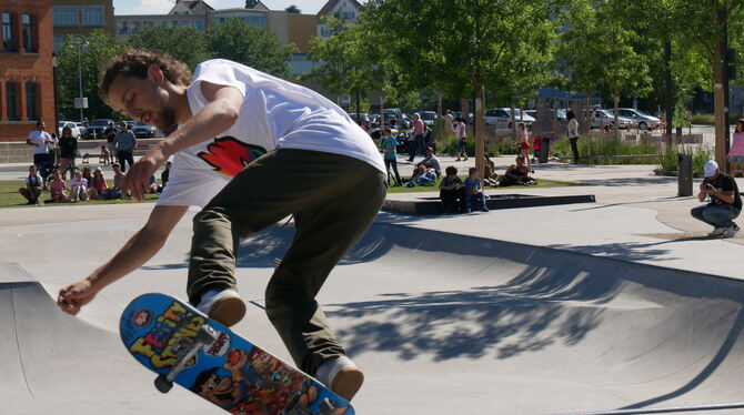 REUTLINGEN. »Jonas macht die Ballerina, yeah, rock’n’roll«, ruft der Kommentator am Rande der Skatebahn am Samstagnachmittag ins Mikrofon. »Hammer, megageil«, fügt er sogleich hinzu und meint damit einen Air direkt aus der Bowl heraus auf die Cooping, wo er entlanggrindet. Alles klar? Die Bedeutung: Jonas ist auf seinem Rollbrett aus der schüsselähnlichen Betonbahn hoch herausgesprungen, direkt auf eine der Geländerstangen, auf der er dann entlangglitt. Oder so ähnlich.