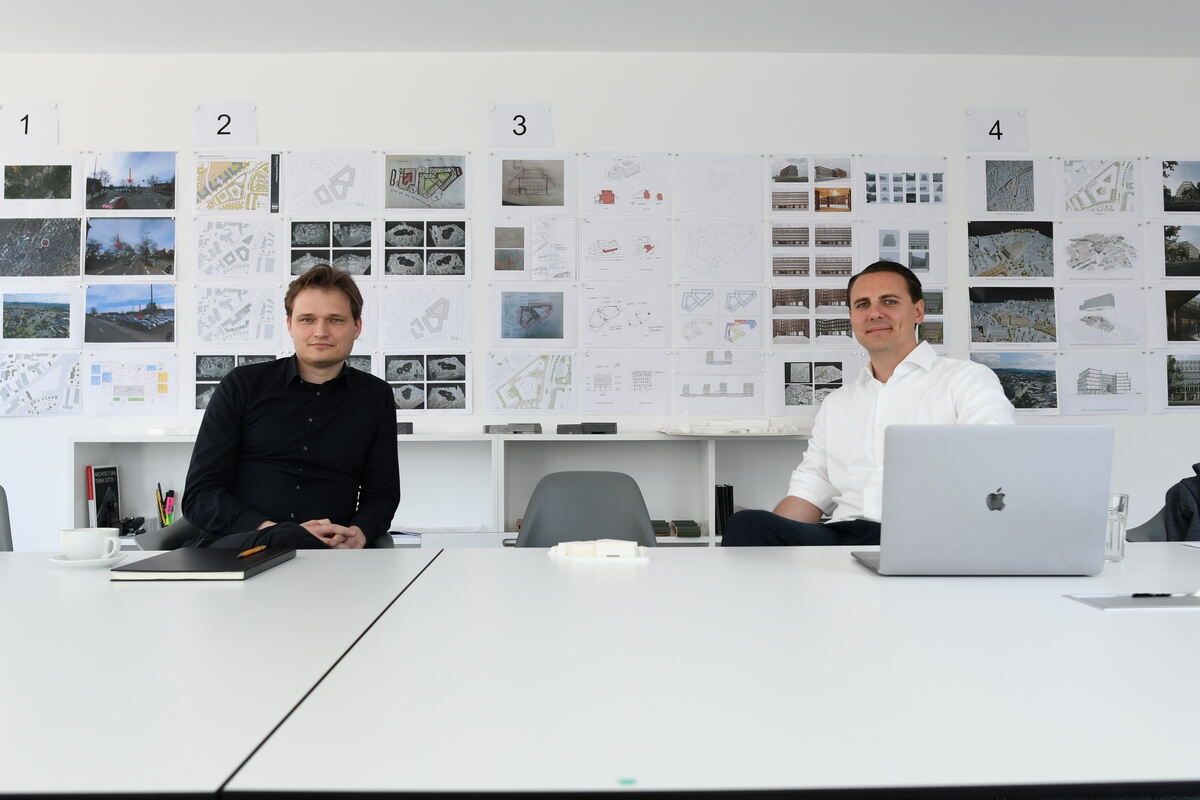Die Architekten Maximilian Köth (links) und Hannes Riehle in ihrem Stuttgarter Büro vor einer Wand voller Skizzen und Entwürfe des neuen Reutlinger Landratsamtes.