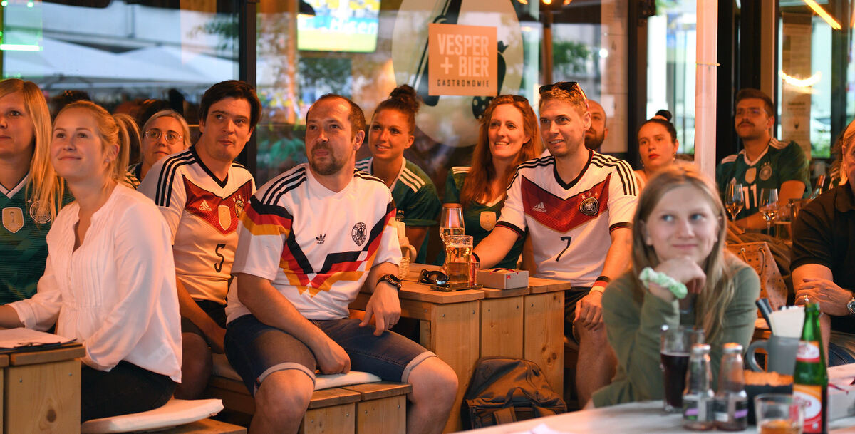 Die Bierbänke im Außenbereich waren auch schon eine Stunde vor Spielbeginn nahezu voll besetzt, einige Fans waren stilecht in Trikot-Shirts der deutschen Nationalmannschaft gekommen. Bei Schnitzel, Salaten und Spätzle unter Platanen entstand eher eine Wohnzimmeratmosphäre als Rudelgucken-Feeling. Doch im Verlauf des Spiels wurde das auch anders. Immer öfter kamen die Aaahs und Oooohs der Fußballfans. Ein größeres Oooh gab es beim Eigentor von Mats Hummels. Auch bei spektakulären Zweikämpfen gingen die Menschen mit.