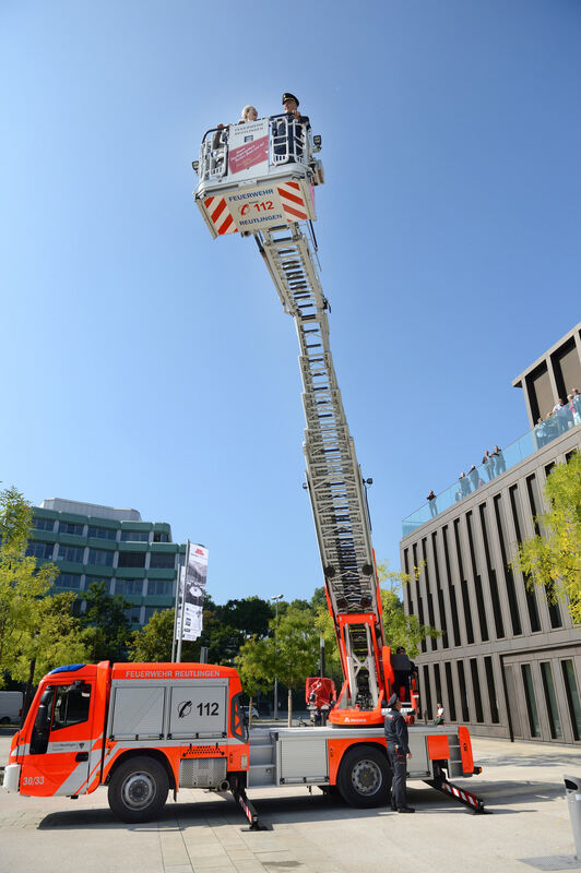 Statt Treppensteigen: Per Drehleiter ging’s auf den Stadtbalkon.