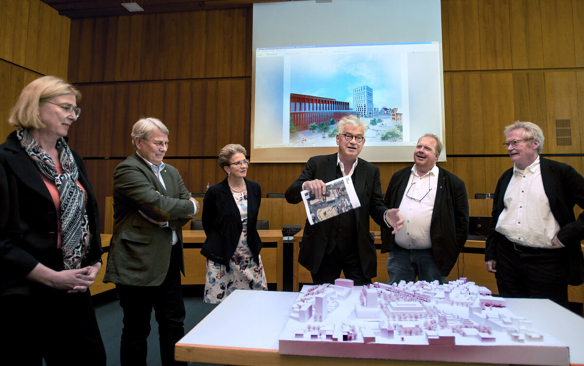 Erster öffentlicher Einblick in die Hotelplanung nach der Jurysitzung (von links): Baubürgermeisterin Ulrike Hotz, Investor Wolfgang Scheidtweiler, OB Barbara Bosch, Architekt Max Dudler, Bauleiter Jochen Schmid und Jury-Vorsitzender Arno Lederer. ARCHIV-FOTO: GER