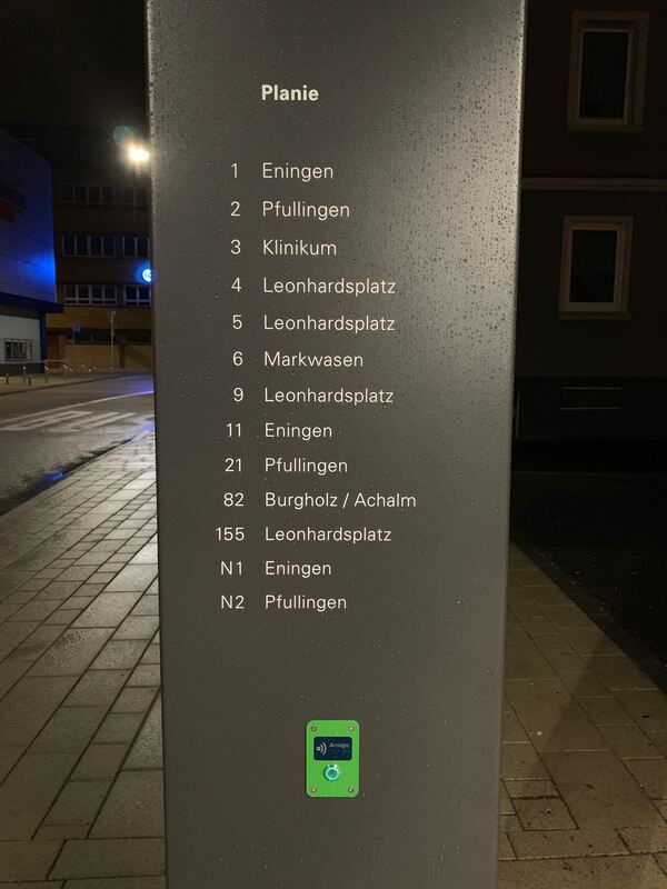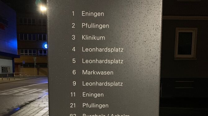 13 verschiedene Linien stoppen an der Planie in der Gartenstraße. Der erste Bus an Werktagen ist die Linie zwei um 4.48. Das Ziel: Pfullingen. Um 4.44 startet der Bus am Zentralen Omnibusbahnhof. Früher als jeder andere Bus in Reutlingen. Noch zwei Minuten steht auf der hell erleuchteten digitalen Anzeige. Noch eine, null, dann verschwindet der Bus vom Display. Erster Bus, erste Verspätung. Hat der Fahrer etwa verschlafen?