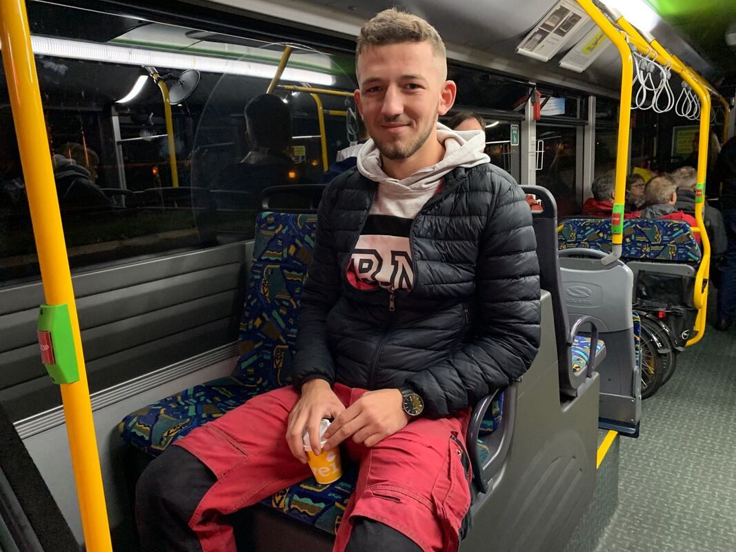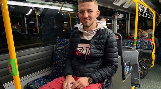 Einer davon ist Mucina Arben. Seine Kleidung lässt vermuten, dass er auf dem Weg zu einer Baustelle ist. Er wirkt ausgeschlafen und fidel, geholfen hat dabei auch der Kaffee, den er in einem Becher mitgebracht hat. Der junge Mann aus Albanien arbeitet im Abbruchgeschäft, reißt Häuser ab. Dafür muss er nach Eningen, bis vor kurzem hat er da gewohnt, dann ist er nach Pfullingen umgezogen und fährt heute zum ersten Mal mit dem Bus zur Arbeit. An der Albstraße verlässt er den Bus und steigt in die Linie eins um.