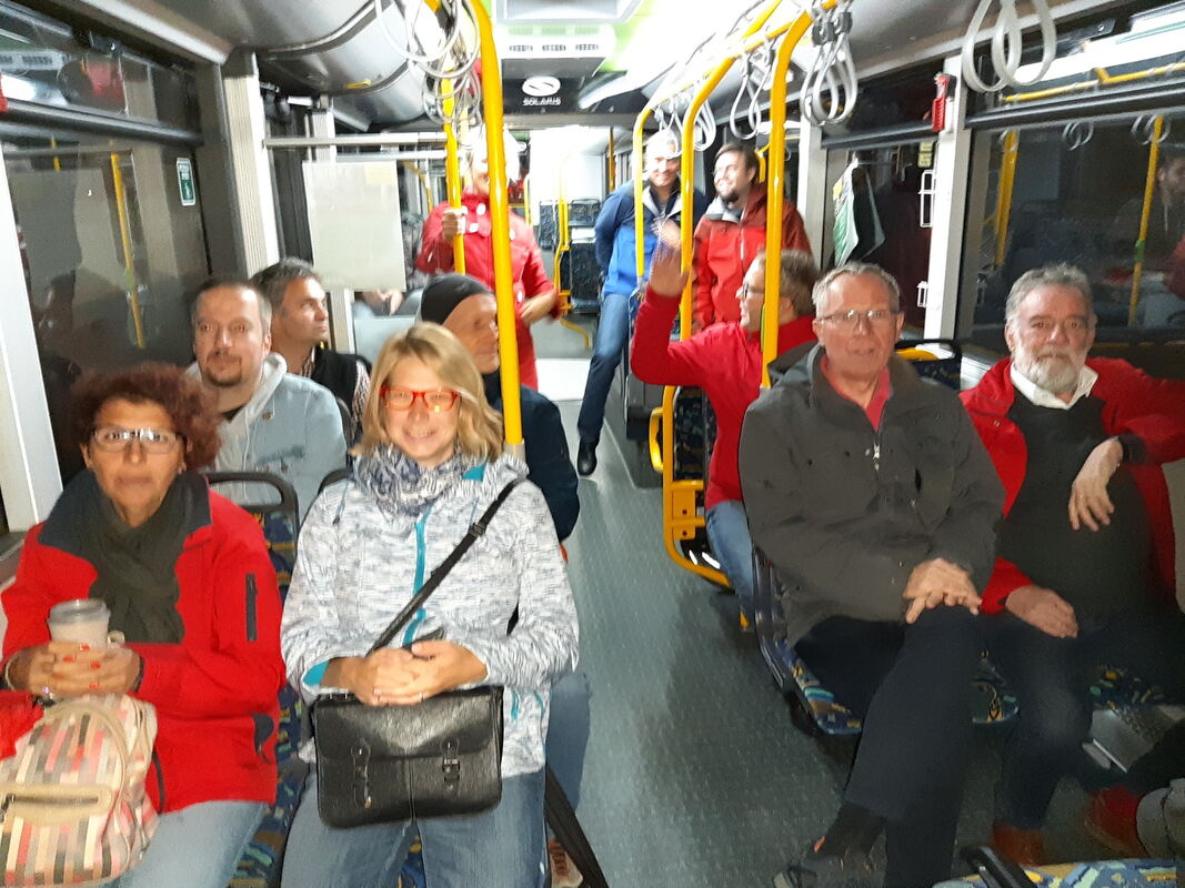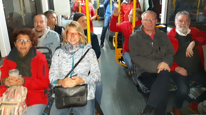 Ansonsten ist in Reutlingens frühestem Bus nur ein weiterer Passagier zu sehen. Während sich die Gruppe der SPD fröhlich scherzend unterhält, hat der junge Mann Kopfhörer in den Ohren und lehnt am Fenster. Erst als der Bus in Pfullingen Ahlsberg kehrt macht um wieder nach Reutlingen zu fahren, steigen weitere Fahrgäste zu.