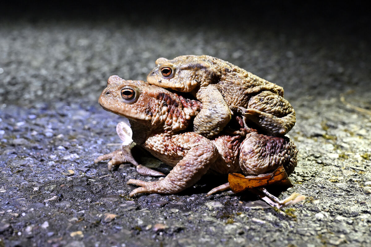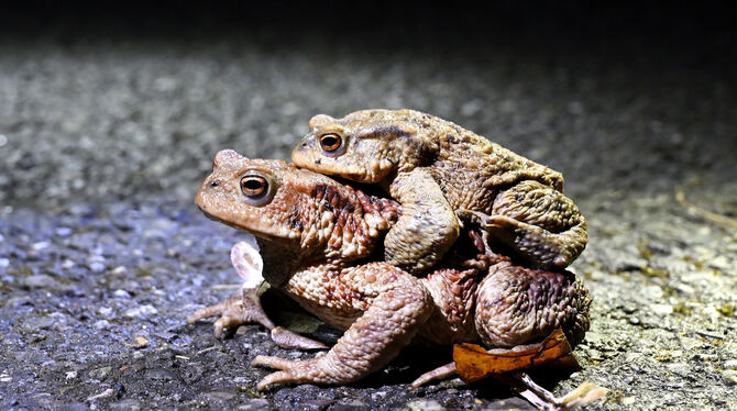 Männchen auf Weibchen: Dieses Krötenpaar ist bereit, den Weg an den See anzutreten.