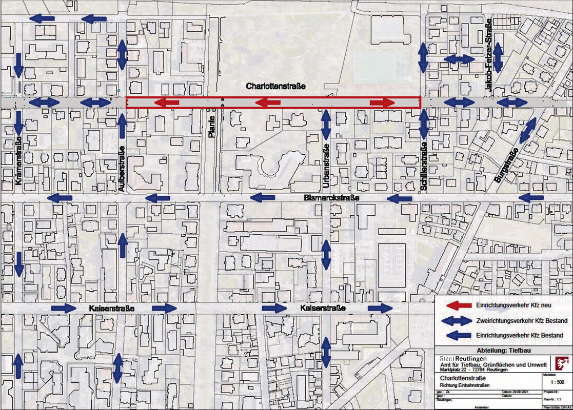 Die Charlotten- straße unterbrechen künftig zwischen Aulber- und Schillerstraße zwei gegenläufige Einbahnstraßen. GRAFIK: STADT