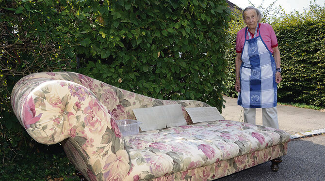 Charlotte Enssle vor ihrem Haus am Lerchenbuckel. Seit einer Woche steht dort ein Sofa. Wem es wohl gehört? FOTO: CONZELMANN