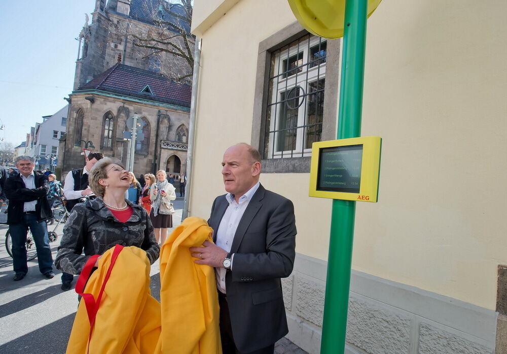 Verkehrsminister Winfried Hermann und Reutlingens Oberbürgermeisterin Barbara Bosch enthüllten die solarbetriebene Haltestellen-Anzeige.