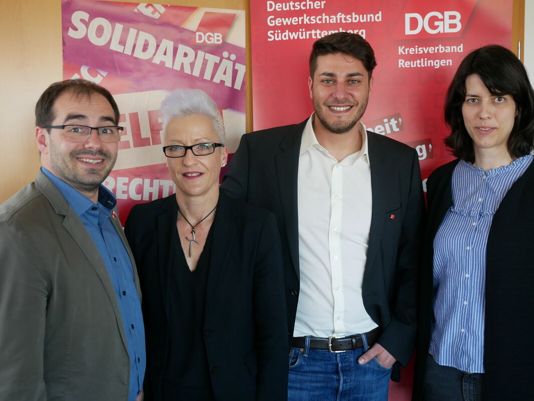 Benjamin Stein (Verdi, von links), Tanja Grzesch (IG Metall), Matteo Scacciante und Mia Koch (beide DGB) erläuterten, was bei den Veranstaltungen zum 1. Mai das vorrangige Thema ist: Solidarität. FOTO: NOL