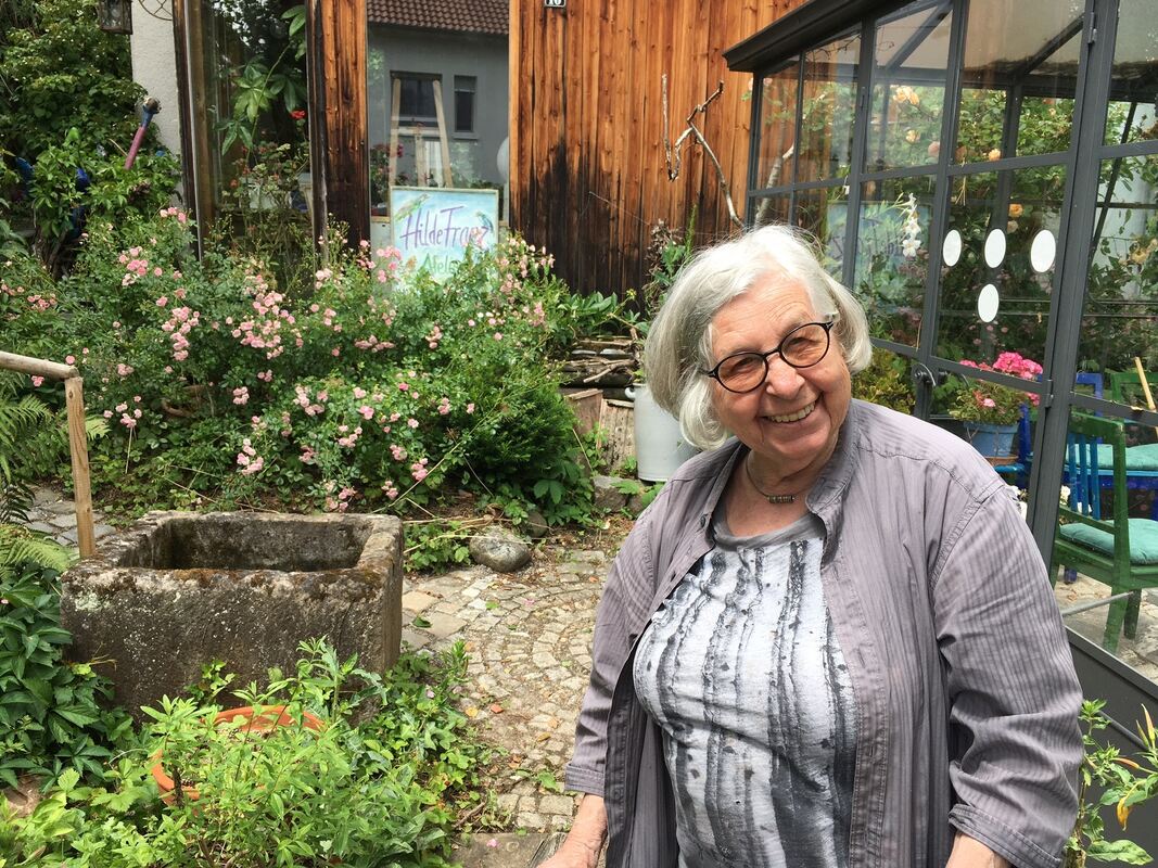 Eine der letzten Aufnahmen – das Foto entstand Ende Juni dieses Jahres – von Hilde Franz: Es zeigt die Künstlerin in ihrem wild-romantischen Garten, der ihr Refugium, Inspirationsquelle und blühender Kultur-Salon in einem war.