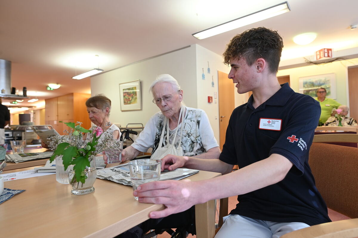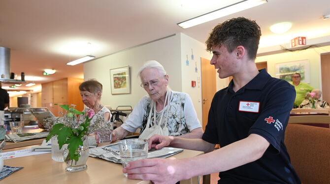 Der Freiwillige Moritz Riedlinger hat Zeit, um im DRK Seniorenzentrum Oferdingen mit der alten Dame Zeitung zu lesen und Mineralwasser zu trinken – das ist Glück.