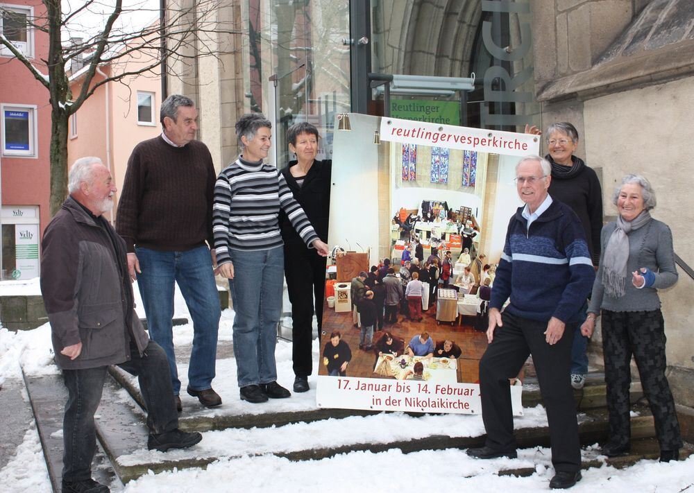 Vesperkirchen-Initiator Klaus Kuntz (rechts vorn) im Kreise lang gedienter Helfer (von links): Friedhelm Fratzke, Ewald Rilling, Irmtraud Stengel, Gertraud Schief, Irene Votteler und Rita Singer. FOTO: STRÖHLE