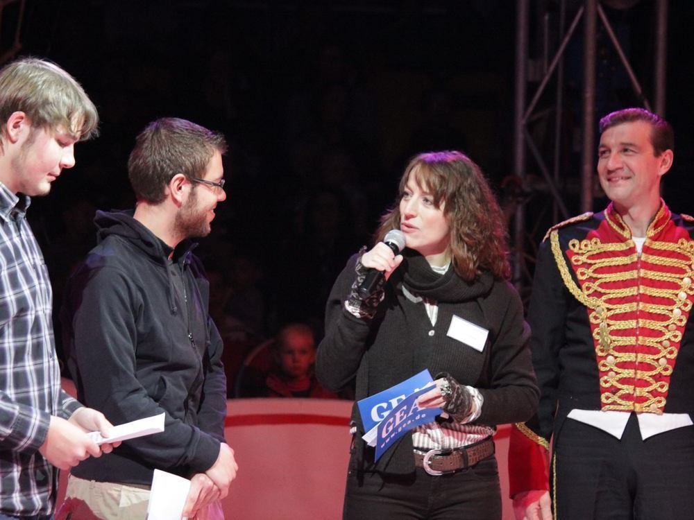 Begeistert über die Hilfsbereitschaft: Iris Goldack vom GEA mit Zirkusdirektor Michael Sperlich und Mitarbeitern des »Youth-Life-Line«-Projekts.