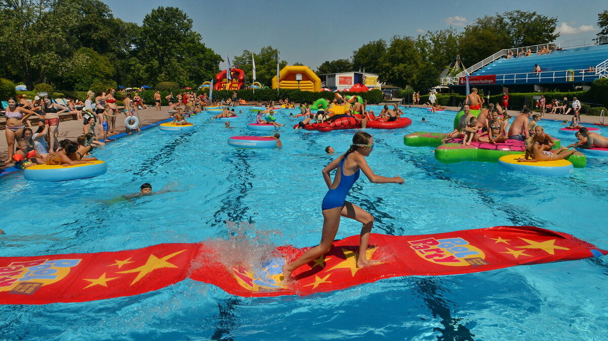 REUTLINGEN. Auf aufgeblasener übergroßer Schildkröte, Riesenkrake und Krokodil tummeln sich die Kinder, quietschen, rufen, lachen, hüpfen ins kühlende Nass. Das Thermometer der DLRG zeigt 29 Grad an. Ein paar Wolken sind am Himmel zu sehen, eine laue Luft weht. Aus den Boxen ertönt die Musik des Films »Fluch der Karibik« und Dominik ruft ins Mikrofon: »Raus aus dem Wasser und runter von den Spielgeräten.«