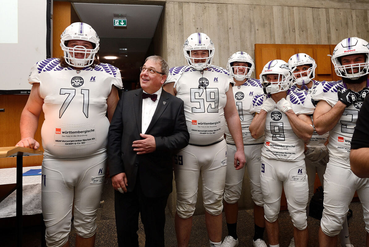 Bevor schließlich Uwe Weber, Amtsleiter für Schulen, Jugend und Sport, die Namen der zu ehrenden Sportler verlas, durften sich in diesem Jahr die Footballer der Eagles vorstellen. American Football kann seit 2015 beim SSV Reutlingen gespielt werden. Von einer praktischen Vorstellung des Sports sahen die Sportler allerdings ab – eher zur Sicherheit der Festgäste, als zur eigenen. Zumal manche Spieler gut und gerne zwei Meter groß sind und sehr breite Schultern haben. Neben den imposanten Erscheinungen wirkte der OB eher schmächtig und scherzte: »Euch zwei stelle ich morgen neben meine Tür.«