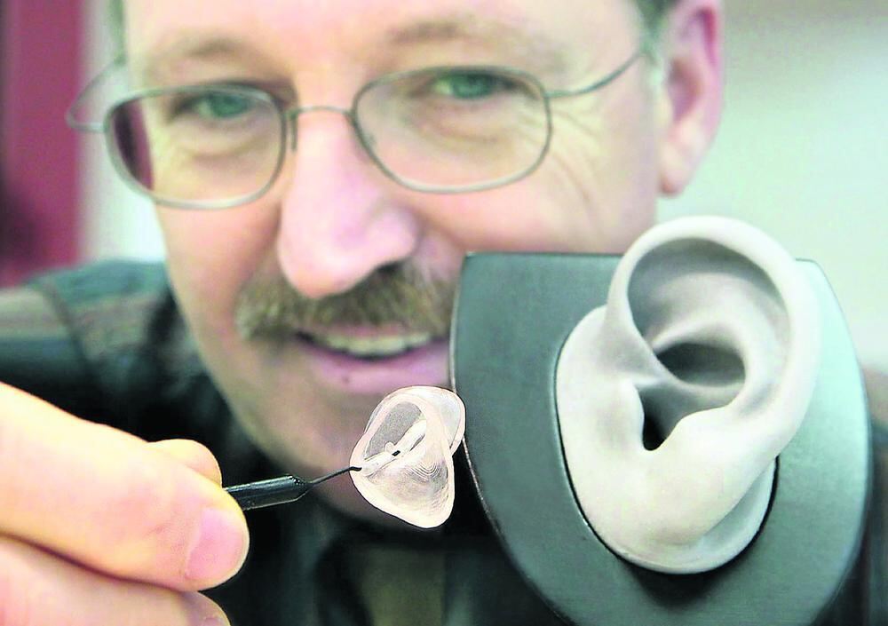 Der Erfinder des »Selec«, Hörakustiker Hans-Georg Kimmerle, mit seinem individuell geformten Gehörschutz.