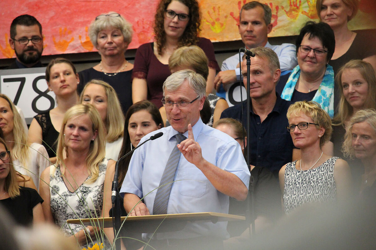 Begleitet wurde der Abend schauspielerisch durch die Moderation zweier Kollegen, die sich als »die Zwoi von der Alb«, als Nachbarn von Herrn Stäbler entpuppten und immer wieder für einen Lacher sorgten. Ihr Geschenk an den scheidenden Schulleiter war ein riesengroßes Lebkuchenherz mit dem Spruch: »Mach mal Pause, Eberhard«. Das Herz war das Symbol für Stäblers herzliche Art. Musikalisch abgerundet wurden die Dankesreden von Lehrern und Schülern der FES, die immer wieder für Abwechslung sorgten. Der Schülerchor sang zu Beginn und die Lehrer-Band regte mit dem Lied »Lord I lift your name on high« schwungvoll zum Mitsingen an. 65 Mitarbeiter dichteten und sangen ein Lied, mit den für Stäbler wichtigen Daten: 1978 startete Eberhard Stäbler seine Laufbahn als Lehrer an der FES. 1991 wurde er Konrektor von Martin Kuhn. 2013 übernahm er die Schulleiterstelle der Grundschule.