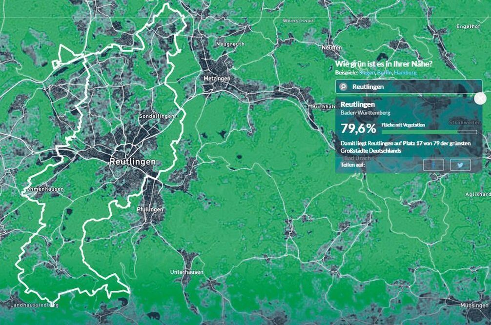REUTLINGEN/BERLIN. Wie grün ist Reutlingen wirklich? Ziemlich grün. Und grüner als viele andere Großstädte in der Republik – das zeigt zumindest der Blick aus dem Weltall: Immerhin fast 80 Prozent der Stadtfläche Reutlingens beherbergen Vegetation.