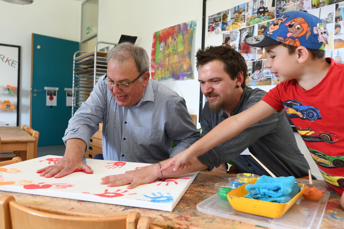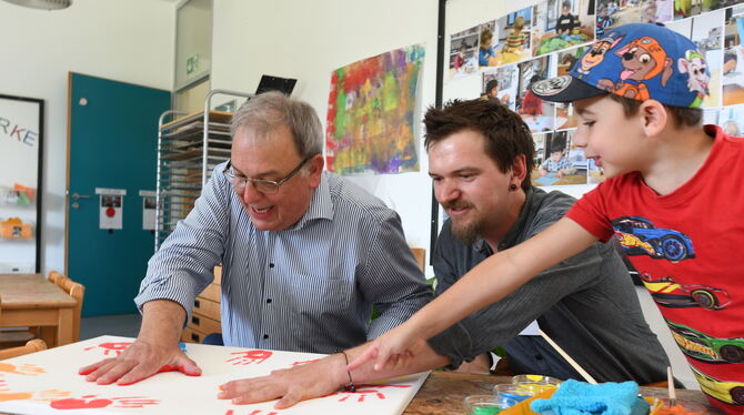 OB Thomas Keck (links) und Einrichtungsleiter Benjamin Hempt hinterlassen im Betzinger Kinderhaus an der Jettenburger Straße ihren Handabdruck zum verspätet gewürdigten 25. Geburtstag des Hauses. FOTO: ZENKE