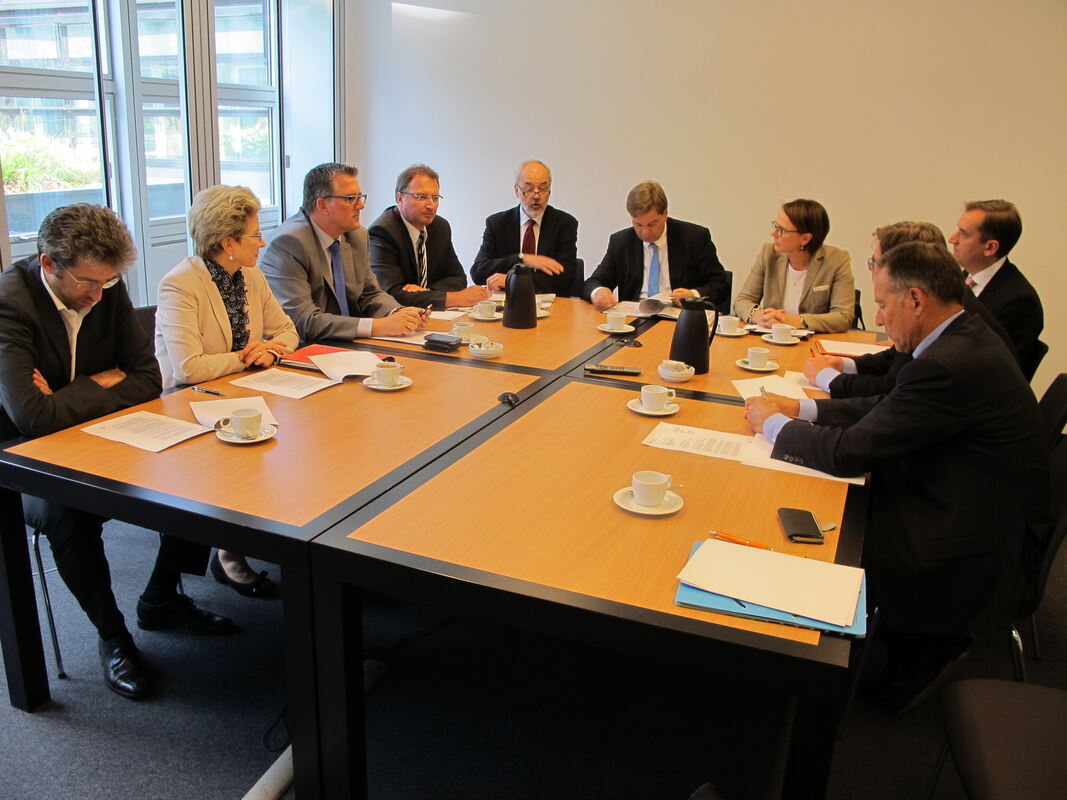 Die Gesprächsrunde in Berlin (von links): die Oberbürgermeister aus Tübingen und Reutlingen, Boris Palmer und Barbara Bosch, der Reutlinger CDU-Bundestagsabgeordnete Michael Donth, die Landräte aus Tübingen und Reutlingen, Joachim Walter und Thomas Reumann, Staatssekretär Enak Ferlemann, die Tübinger CDU-Bundestagsabgeordnete und Staatssekretärin Annette Widmann-Mauz, der persönliche Referent von Ferlemann, Dr. Wolf-Rüdiger Biernert, der Tübinger SDP-Abgeordnete Dr. Martin Rosemann (halb verdeckt) und der Regionalverbandsvorsitzende Eugen Höschele. FOTO: PR