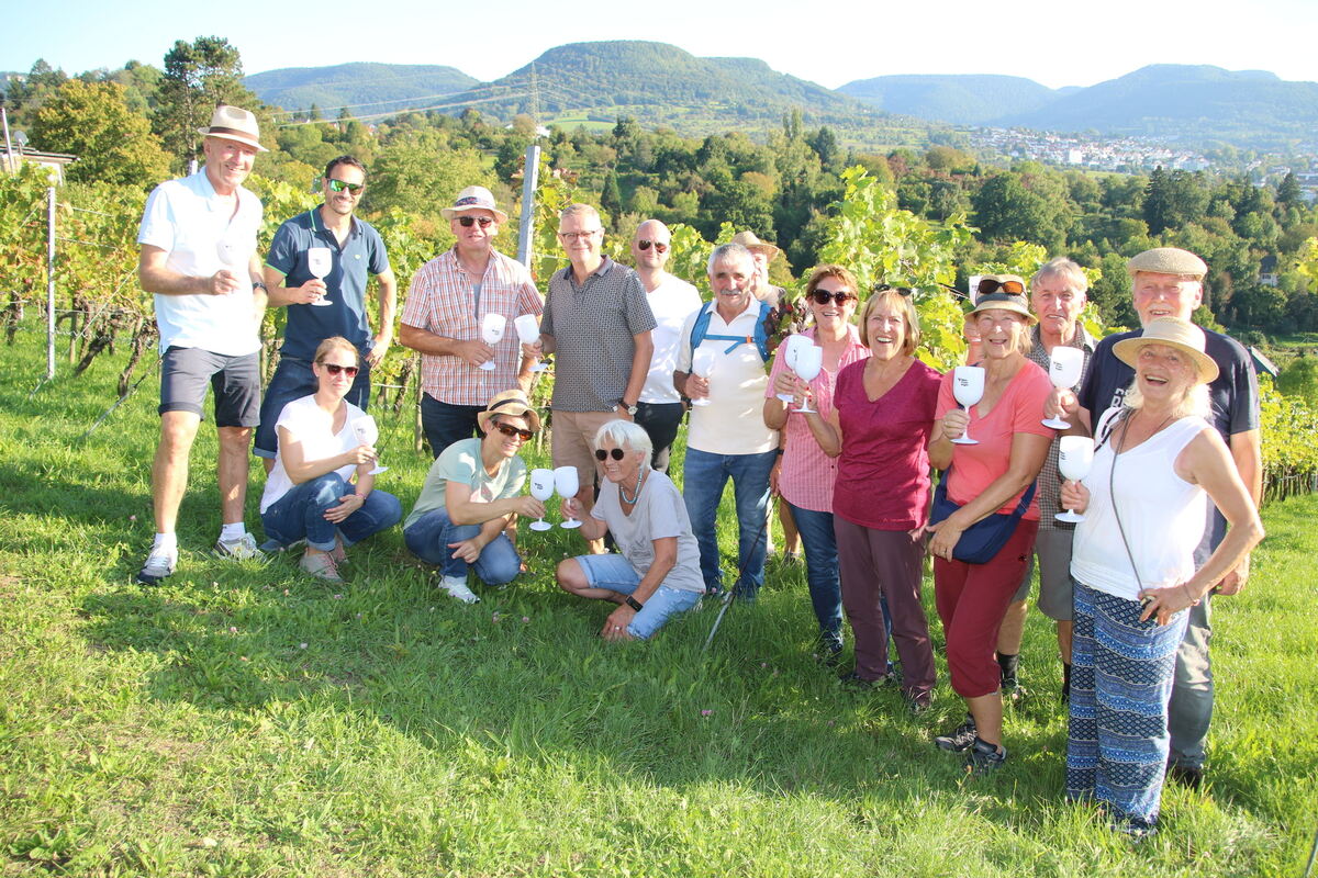 Hier ist Wohlsein: Die Gewinner der GEA-Aktion und Stadtführer Thomas Weiblen (links) im städtischen Weinberg, dem Schlusspunkt der Themenführung