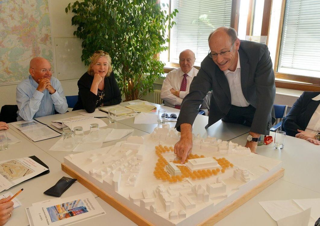 Bei einer Pressekonferenz im Juni waren noch alle guter Dinge, dass das Hotel neben der Stadthalle rasch gebaut werden kann (von links): Investor Manfred Steinbach, Baubürgermeisterin Ulrike Hotz, Betreiber Manfred H. Toennes, Stadthallen-Projektleiter Klaus Kessler und die Geschäftsführerin der Stadthallen-GmbH, Petra Roser. ARCHIVFOTO: NIETHAMMER