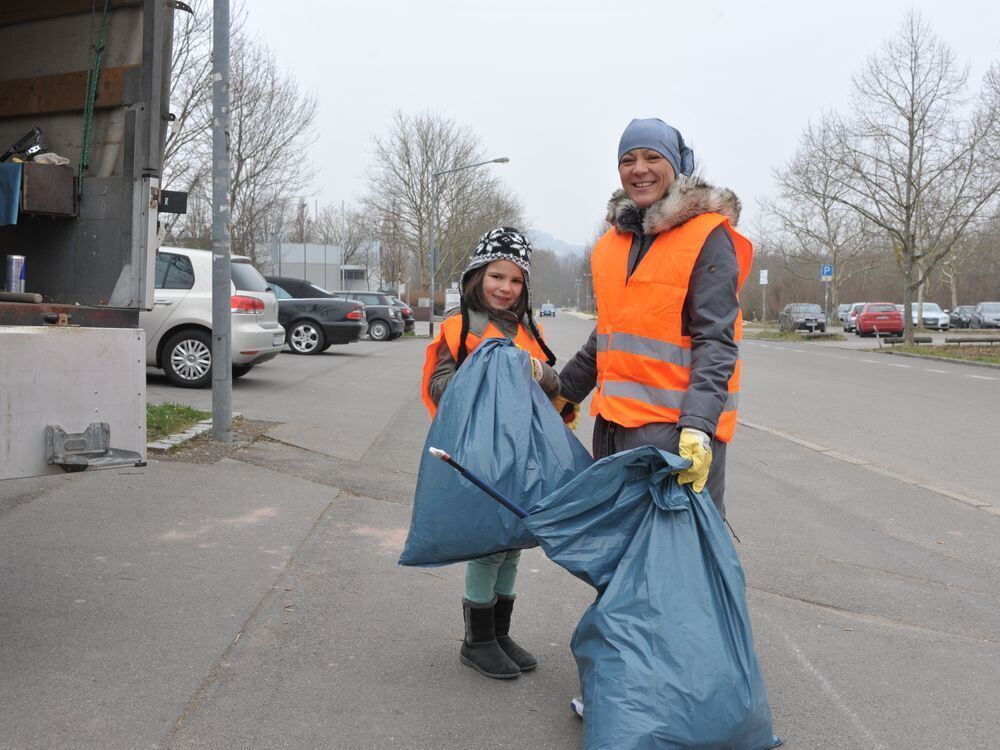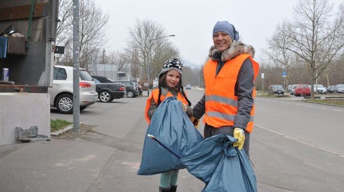 Flotte Feger: Nedeljka Petrovic mit ihrer Tochter Katarina (7) bei der Stadtputzete im Einsatz an der Kreuzeiche. (Archivfoto)