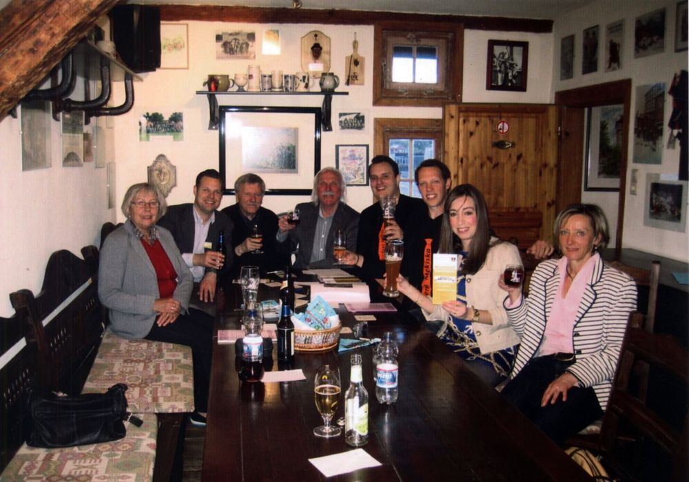 Heidi Schlosser, Carl-Gustav Kalbfell, Erich Losch, Wilhelm König, Michael Schmidt, Jens Mekiska, Camila Romanato und Manuela König (von links) beim Gartentor-Stammtisch. FOTO: SCHLOSSER