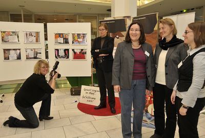 Reutlinger Standpunkte gegen häusliche Gewalt, festgehalten von der Fotografin Gerlinde Trinkhaus: Zur Freude von Frauenhaus-Leiterin Irene Köpf (Dritte von rechts) war der Auftakt zum Fachtag in der VHS ausgesprochen lebhaft.