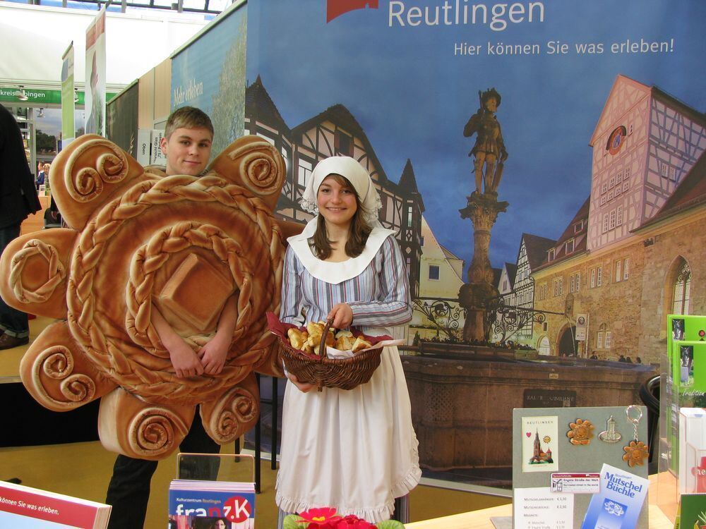 Wirbt für Reutlingen wie immer auf der CMT: die Mutschel mit dem Bäckermädchen.