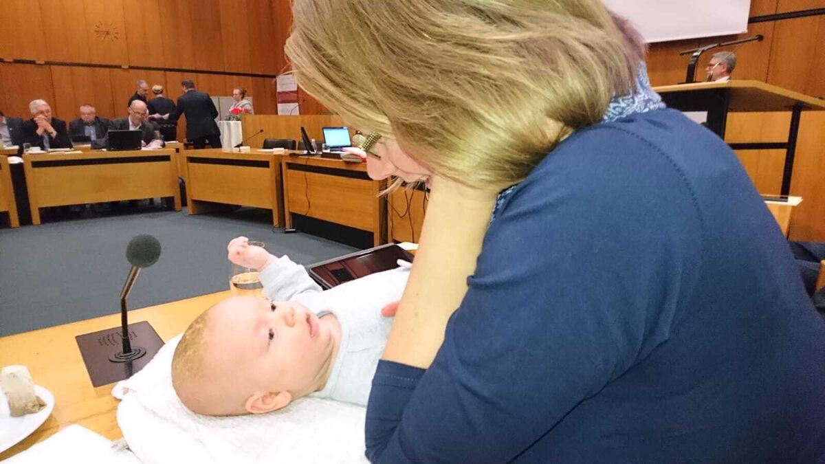 Beratung mit Baby an Bord: Silke Bayer und Laura bei einer Gemeinderatssitzung. FOTO: PRIVAT