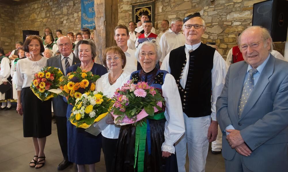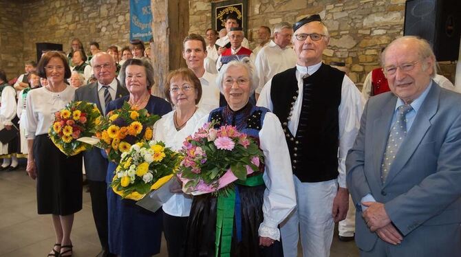 Matinee mit Gesang und Ehrungen: Sybille Weitmann (ganz links), Vorsitzende der Betzinger Sängerschaft, mit den Jubilaren (von links) Walter Weiss, Margot Steinert, Josefine Stackelies, dahinter Michael Schucker, das Ehepaar Schellhorn und Hermann Franz.