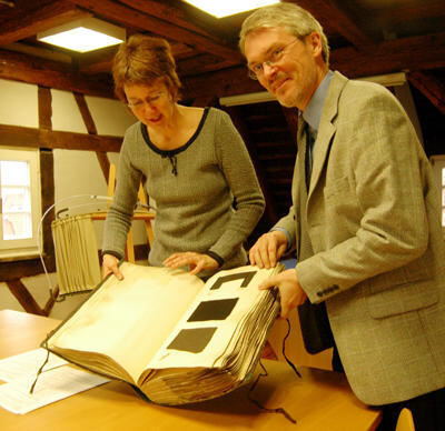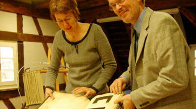 Früher ein Lehrbuch für die Schüler der Webschule: Martina Schröder und Harald Dallmann mit einem Stoffmusterbuch aus London von 1878.