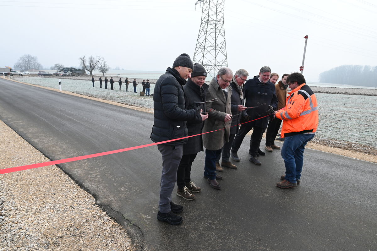 Bei minus fünf Grad verteilt Bauleiter Marcus Friedrich an Landräte und Bürgermeister Scheren, damit die das Eröffnungsband der Bempflinger Straße durchschneiden können. Im Hintergrund wartet die Schützengesellschaft Bempflingen mit ihrer Böllerkanone.