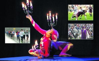 Chinesische Akrobatik in Tübingen: Das Dezember-Motiv des GEA-Kalenders 2008 stammt von der Gala-Veranstaltung des schwäbischen Turnerbunds. Die kleinen Bilder zeigen die Kalenderblätter der Monate Januar (Alb-Gold-Winterlauf), Mai (SSV-Spiel) und Oktober (Marbacher Hengstparade).