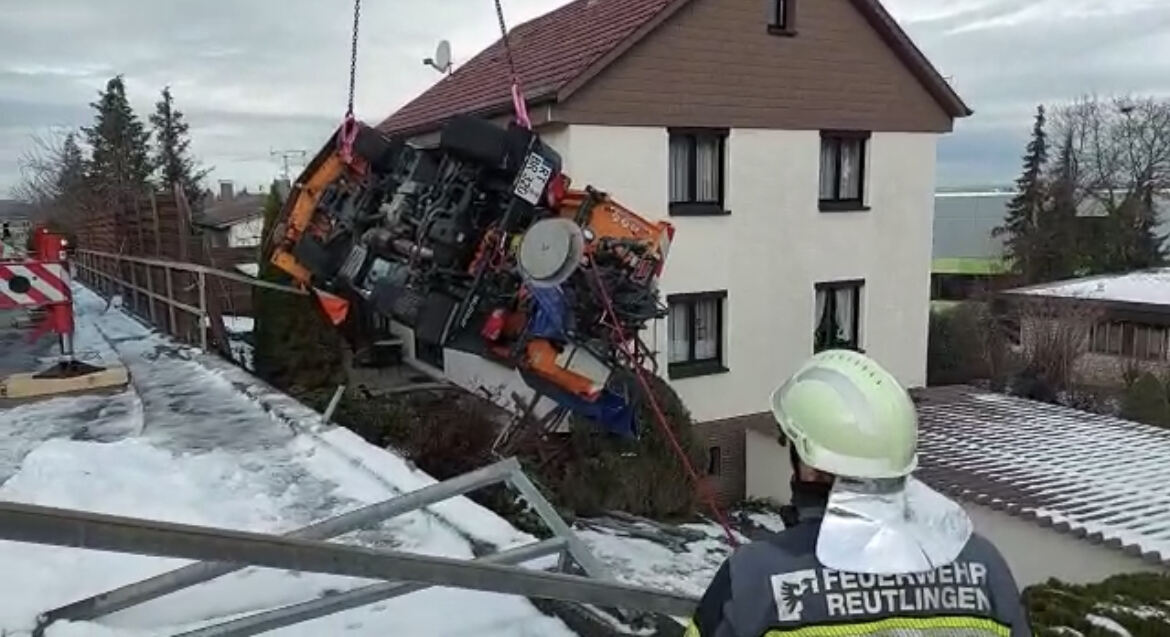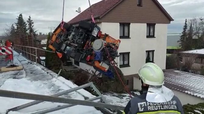 Seit Mittwoch liegt ein Streufahrzeug im Garten eines Reutlinger Wohnhauses. Heute wird es aufwendig geborgen, aufgerichtet und abtransportiert. Ein nicht alltäglicher Einsatz.