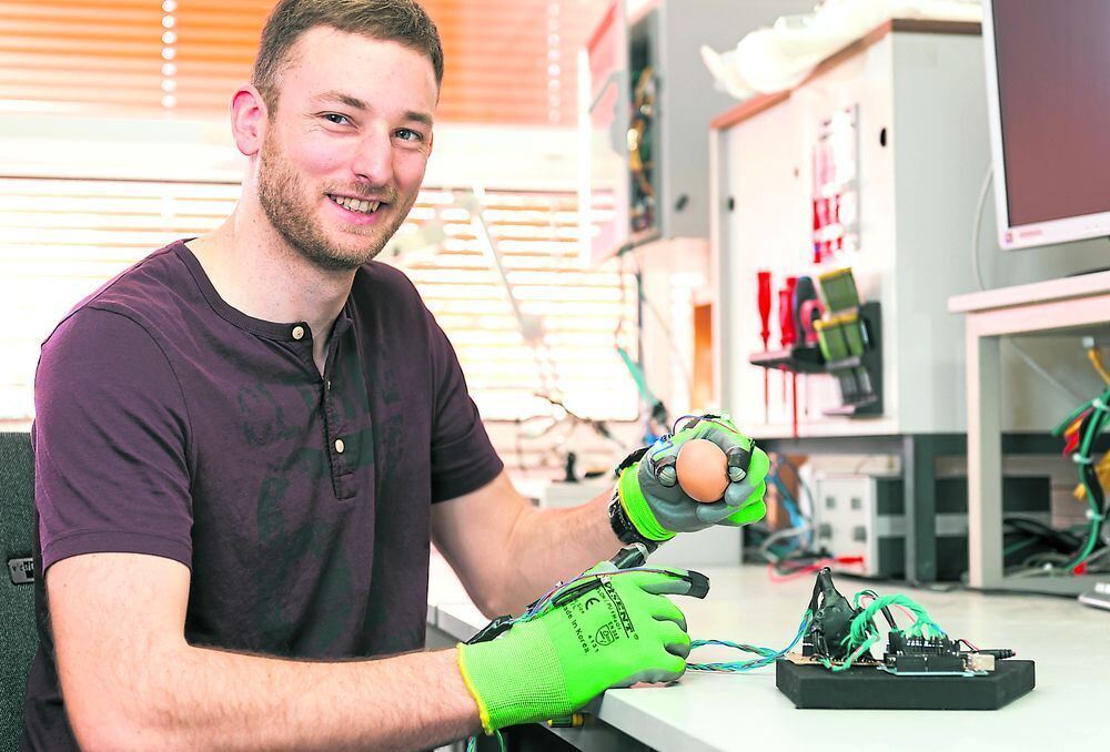 Für das, was Simon Springmann entwickelt hat, ist ein rohes Ei das beste Demonstrationsobjekt: Wie kräftig muss oder darf man es anfassen, damit es nicht zerbricht, aber die Hand es sicher greift? Der Prototyp des sensitiven Handschuhs stammt zunächst noch aus dem Baumarkt. FOTO: STEFFEN SCHANZ