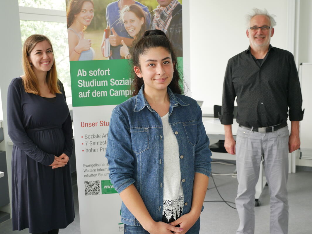 Leonie Wild und Dilek Gülfidan (von links) studieren auf dem Reutlinger Campus im fünften Semester Soziale Arbeit. Zusammen mit Leiter Professor Dr. Jo Jerg informierten sie über den Studiengang. FOTO: LEISTER