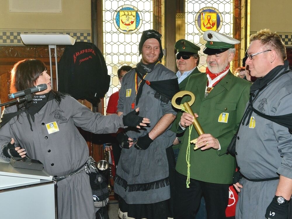 Eine Sonnenbühler Scheiterhau-Hexe rang dem Landrat den Schlüssel zum Landratsamt ab.