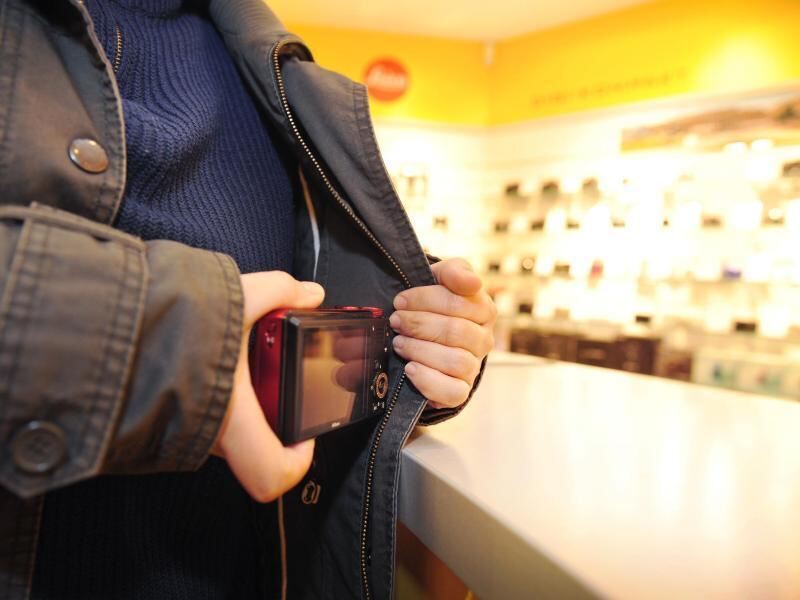 Eine Frau steckt in einem Fotogeschäft eine Kamera unter ihre Jacke. Foto: Jan-Philipp Strobel/Illustration